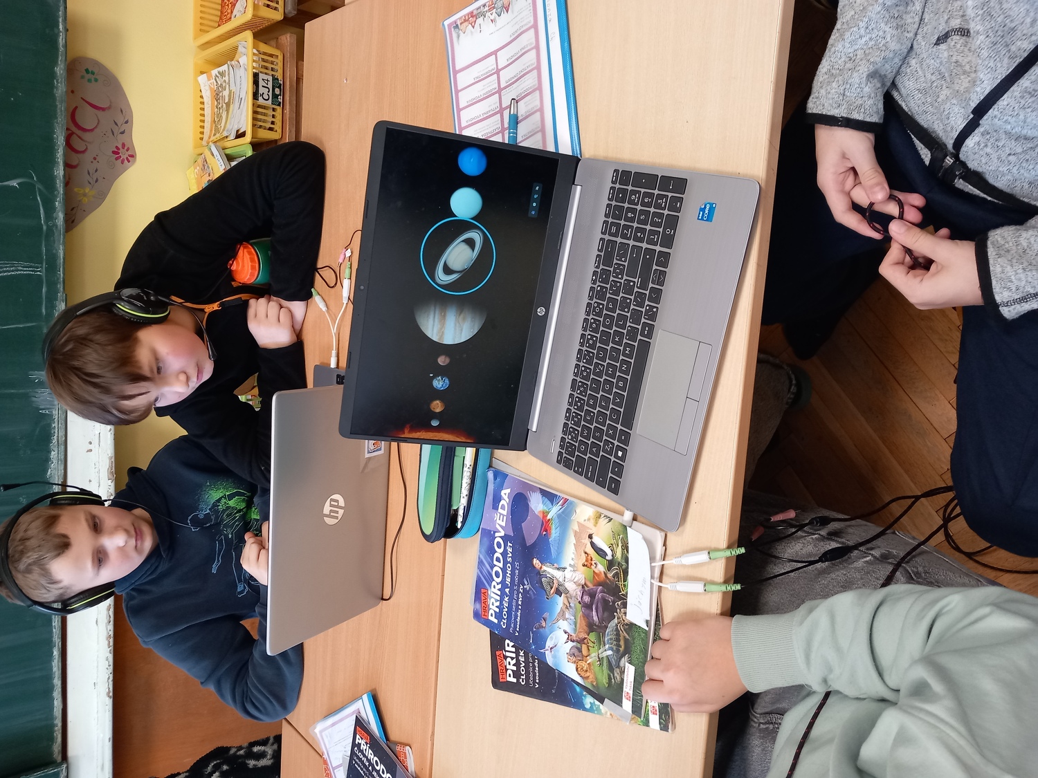 V páté třídě jsme už dost zkušení a samostatní. Informace nezískáváme jen od paní učitelky, ale dokážeme je vyhledávat i na internetu. Učíme se pracovat s různými zdroji, upravovat texty a využívat výuková videa. Ty nám výuku zpestřují a pomáhají lépe porozumět probíranému učivu, jako například při dnešní hodině o vesmíru.
