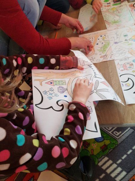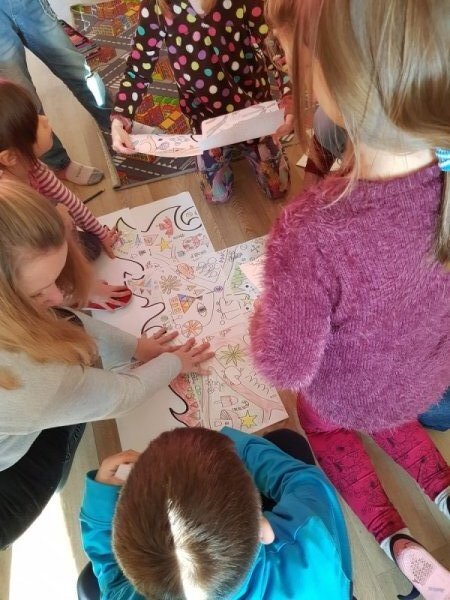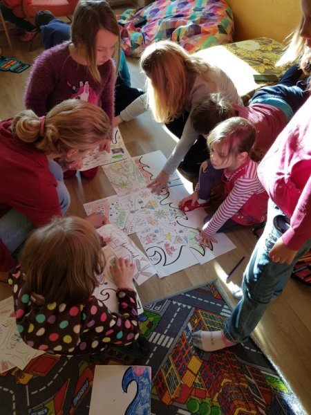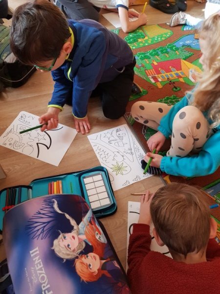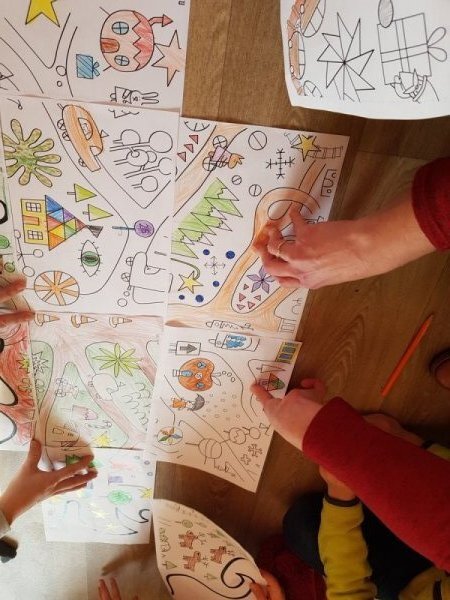 Po přestávce 1. a 2. ročník spojil síly při aktivitě vybarvování částí skládanky a pak skládání v jeden celek. Kromě toho, že jsme si zavybarovavali a zaskládali, jsme si také uvědomili, že dokud vidíme každý jen část, můžeme se lehko splést v tom, co to vlastně vidíme, ale když dáme naše části dohromady, hned máme obrázek ucelenější a můžeme si být o něco jistější. To, co se mohlo zpočátku po dílech jevit jako rozbouřené moře, byl nakonec krásný vánoční strom.