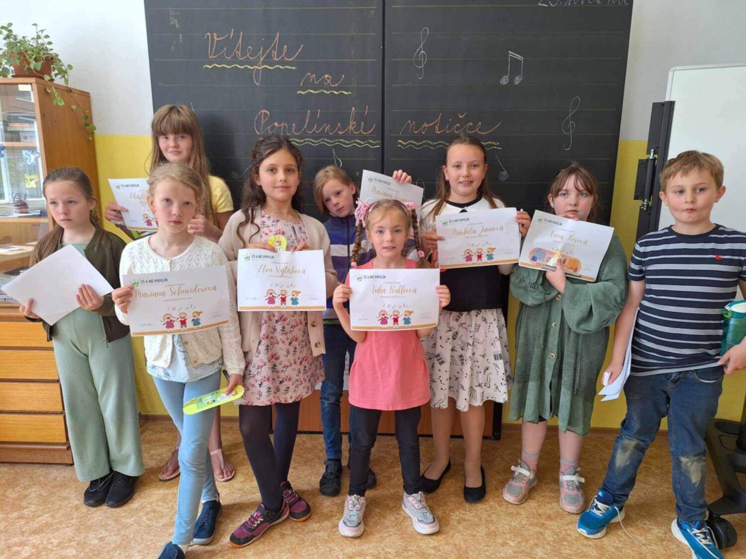 Na hudební soutěž Popelínská notička do ZŠ Popelín jelo z naší školy těchto devět žáků.