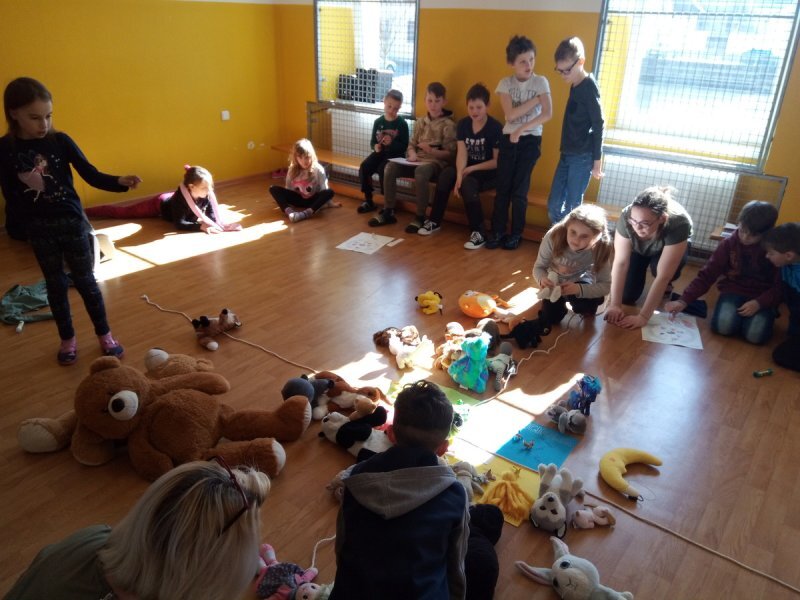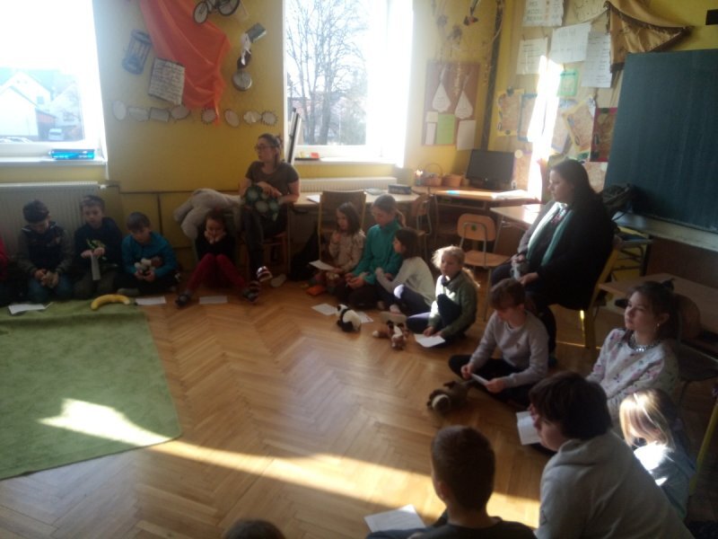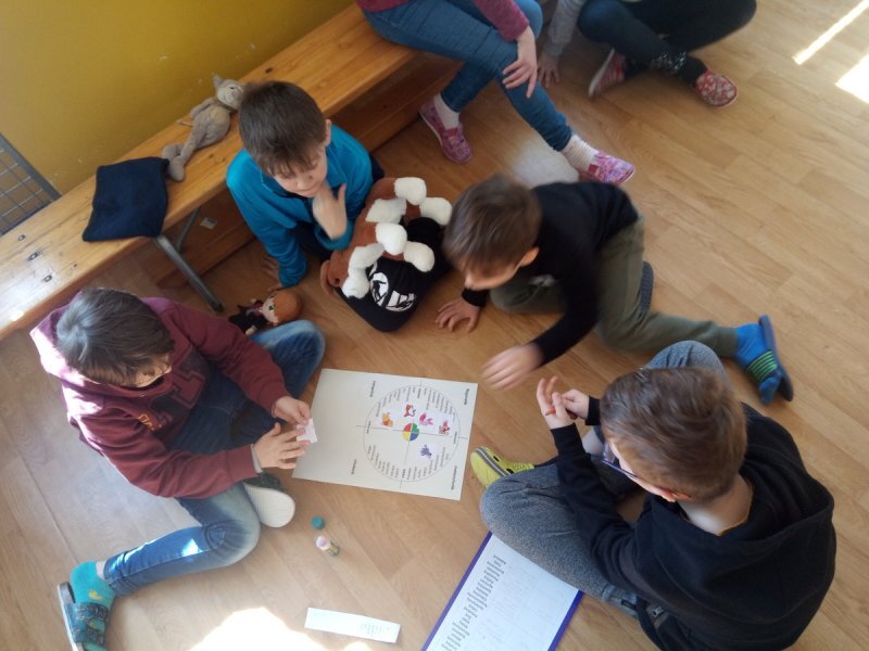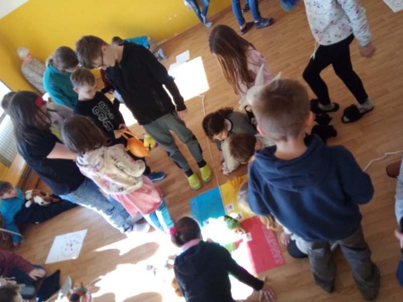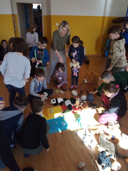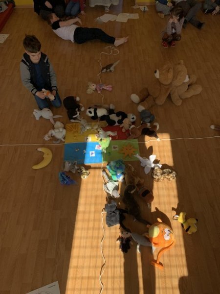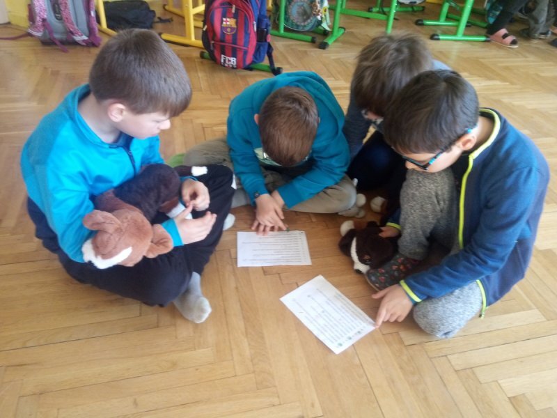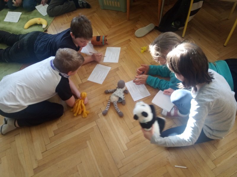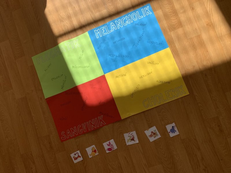 Potom jsme se šli seznámit s jednotlivými zvířátky. Každé zvířátko má nějaké výrazné vlasnosti, naším úkolem bylo je co nejlépe popsat. Na závěr jsme si pak ukázalo, že tyto vlastnosti tvoří prostor lidských charakterů, po které používáme slova jako sangvinik, cholerik, melancholik a flegmatik. Do tohoto prostoru jsme umístili zvířátka ze Stokorcového lesa a na závěr i našeho plyšáčka - který zastupoval nás samotné, jak se vidíme.