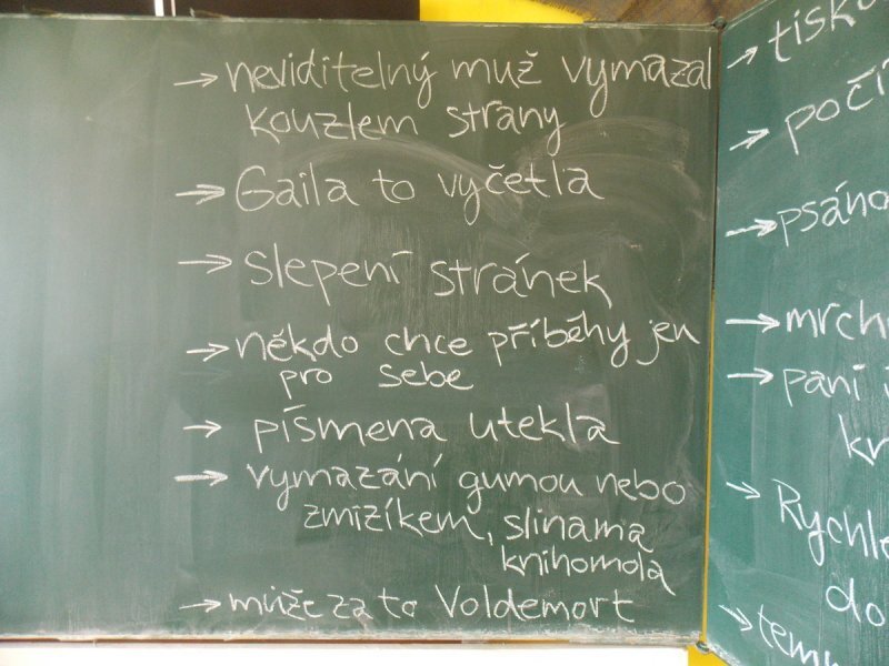 A nebyly to ledajaké knihy, ve slovnících například texty zůstaly, poztrácela se pouze písmena z některých knih s příběhy. Začali jsme tedy brainstormingem ve skupinách - co se asi mohlo stát? A hlavně - proč? Budeme to zjišťovat po celý školní rok...